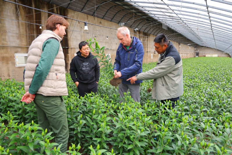11月23日,荷蘭簡懷特公司資深花卉專家一行走進崗埠農場高效農業示范園,深入百合花種植基地,現場指導園區百合花種植管理工作。